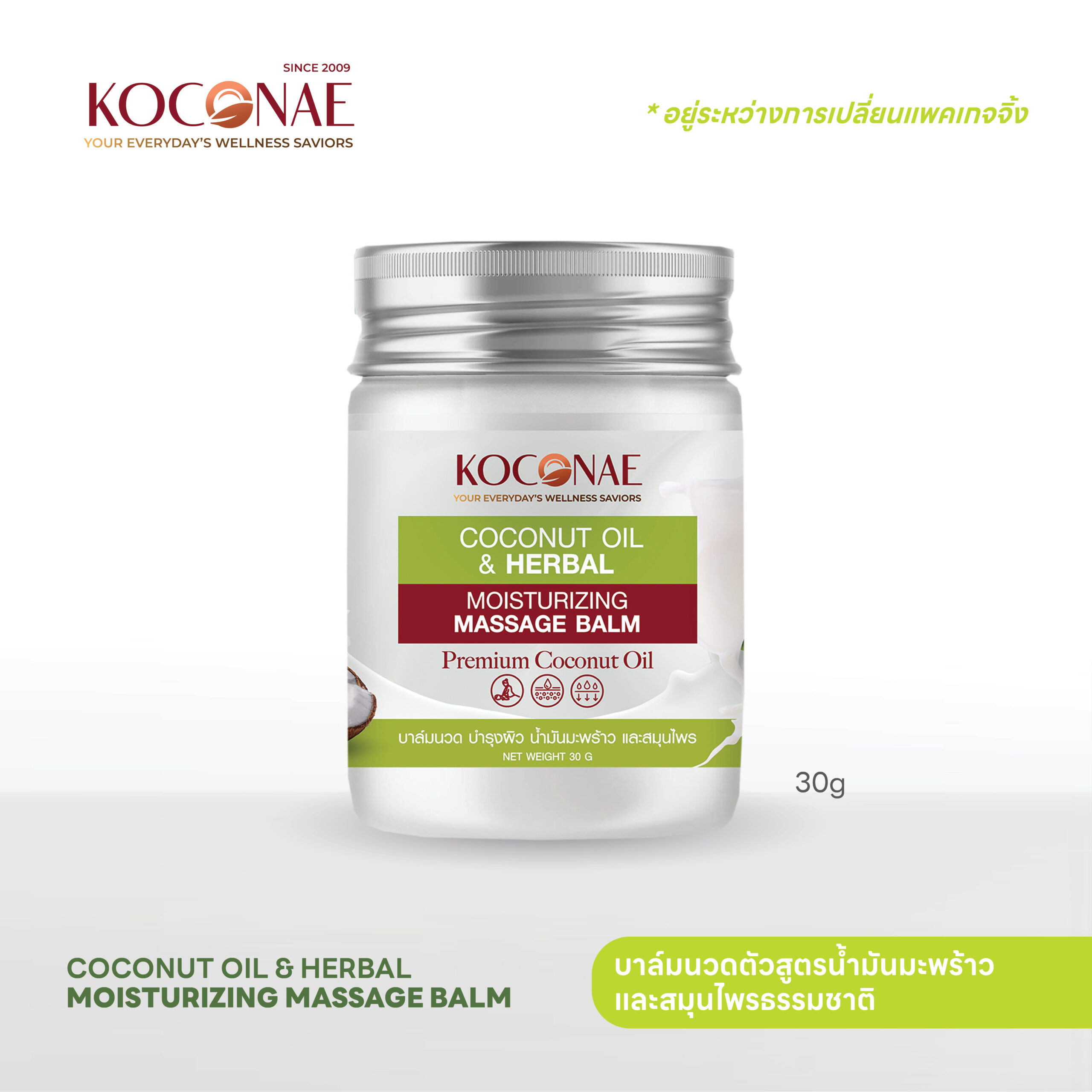 Koconae Coconut Oil & Herbal Moisturizing Massage Balm บาล์มนวดบำรุงผิวที่ผสานน้ำมันมะพร้าวคุณภาพสูง กับคุณค่าสมุนไพรธรรมชาติหลากชนิด เช่น น้ำมันไพล น้ำมันตะไคร้หอม และน้ำมันเปลือกมะนาว พร้อมกลิ่นหอมผ่อนคลายจากธรรมชาติ ที่ช่วยให้รู้สึกสดชื่นขณะใช้ มาพร้อมเนื้อสัมผัสนุ่ม ละลายง่ายเมื่อสัมผัสผิว ไม่เหนียวเหนอะหนะ และให้ความรู้สึกสบายผิวทุกครั้งที่ใช้